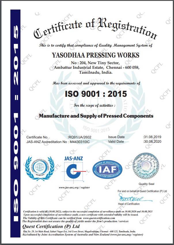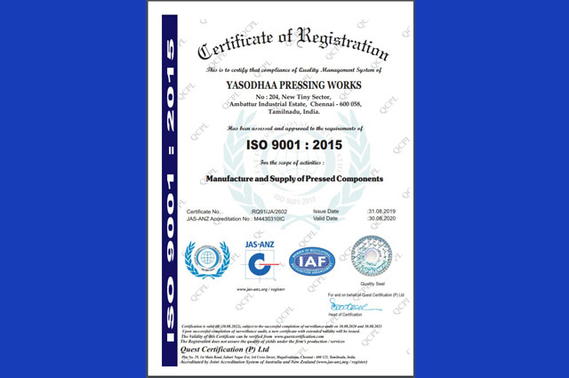 Welcome to Yasodhaa Pressing Works an ISO 9001:2015 Certified Company established in the year 1993.